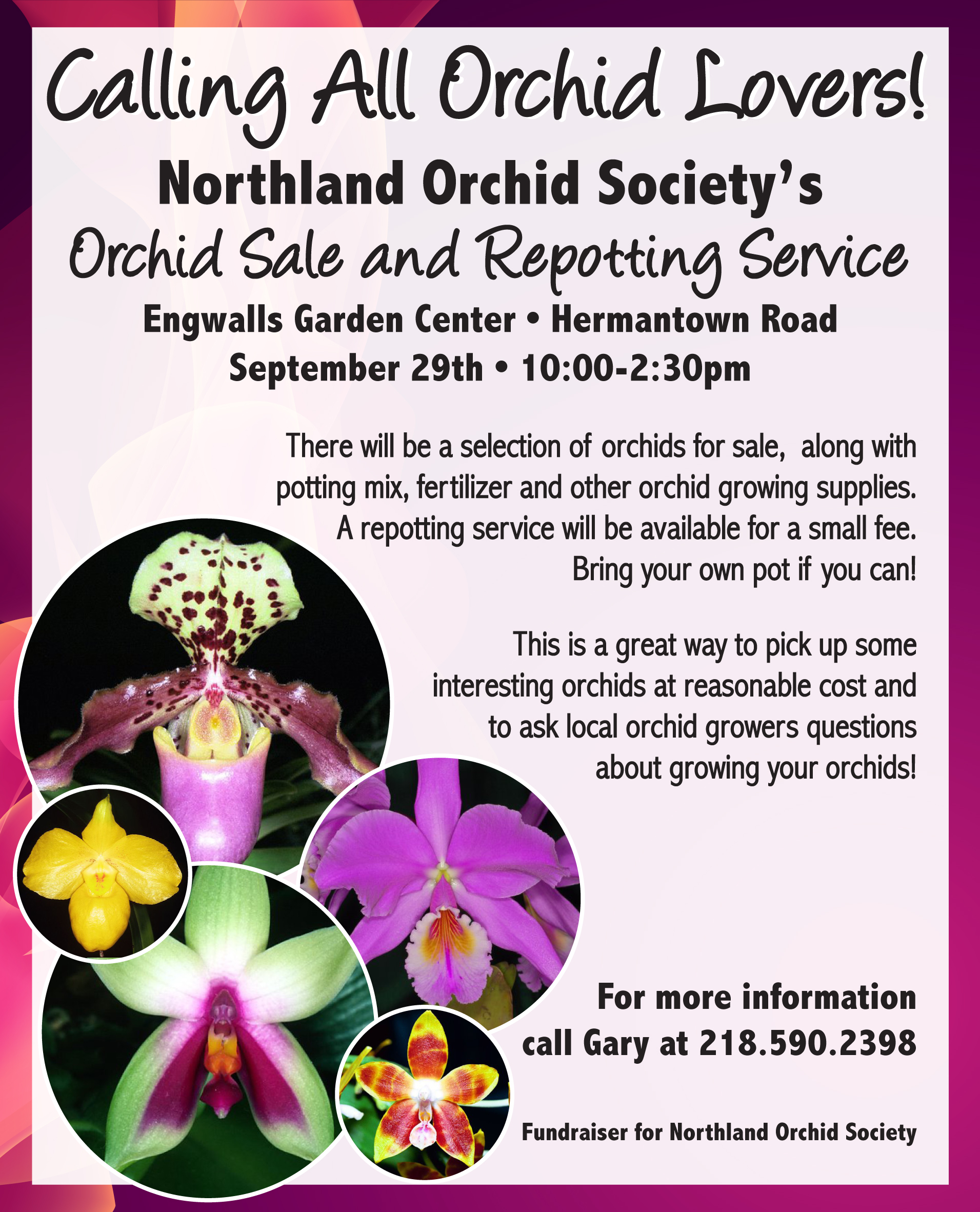 Northland Orchid Society holds an annual orchid sale each fall, which is the society's main fund-raising event and is open to the public. There is a selection of orchids from members for sale, along with potting mix, fertilizer, and other orchid growing supplies. A repotting service is available for a small fee.